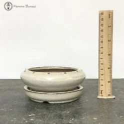 Lovely ceramic cream round shaped and glazed Bonsai pot with matching drip tray.