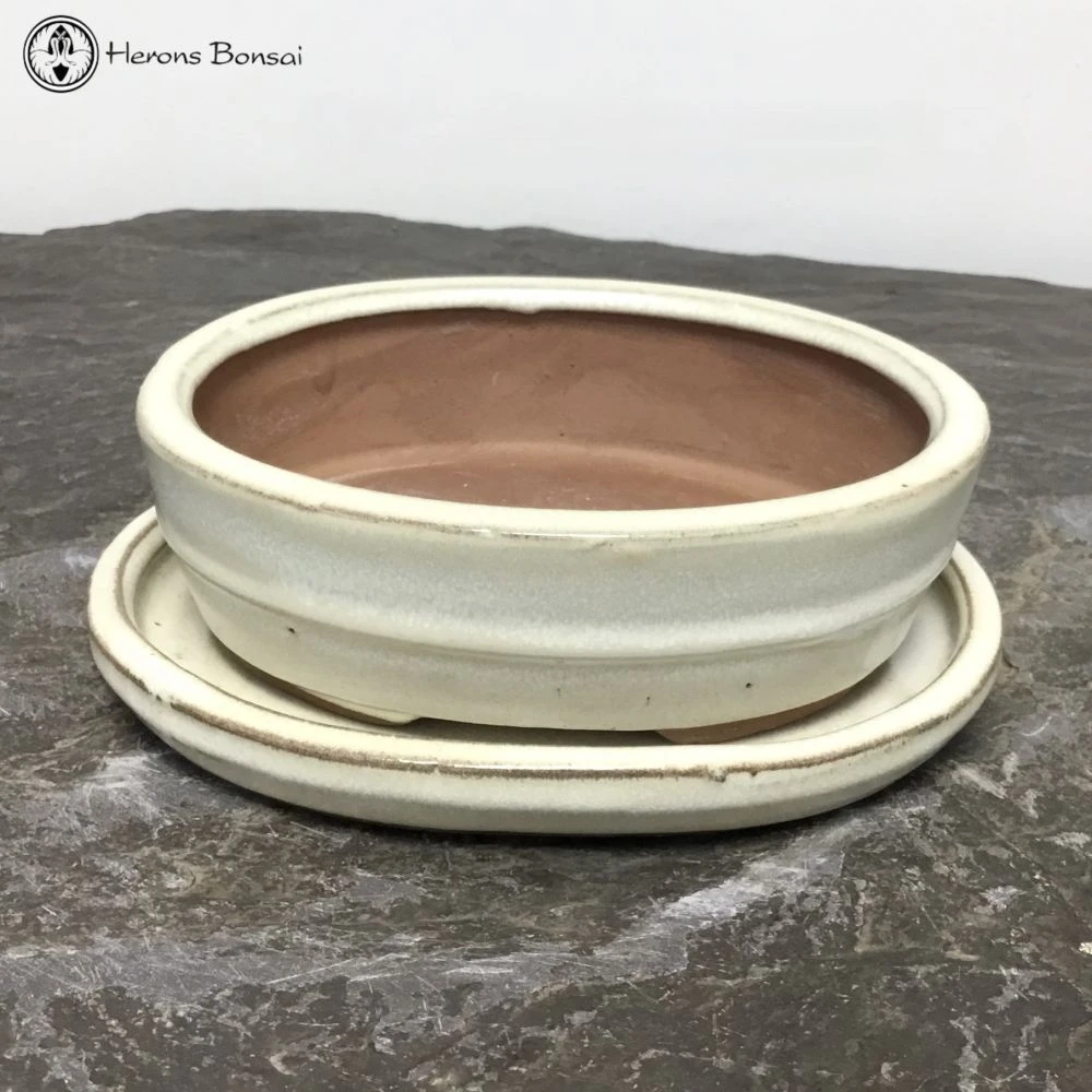 Cream Oval Ceramic Bonsai Pot & Drip Tray (15cm)
