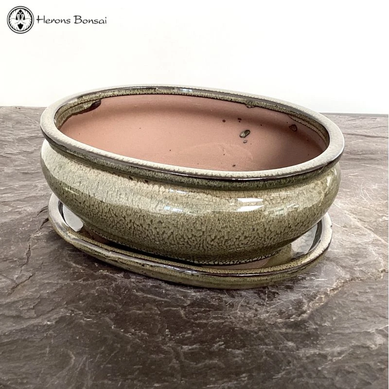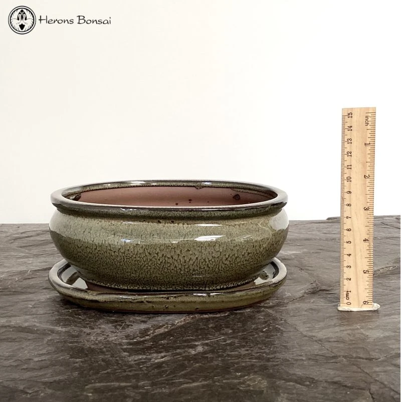 Olive Oval Bonsai Pot with Matching Drip Tray. Recommended for indoor use.