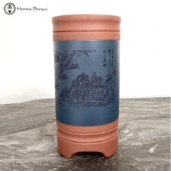 Round Unglazed Cascade Bonsai Pot with Blue Decoration