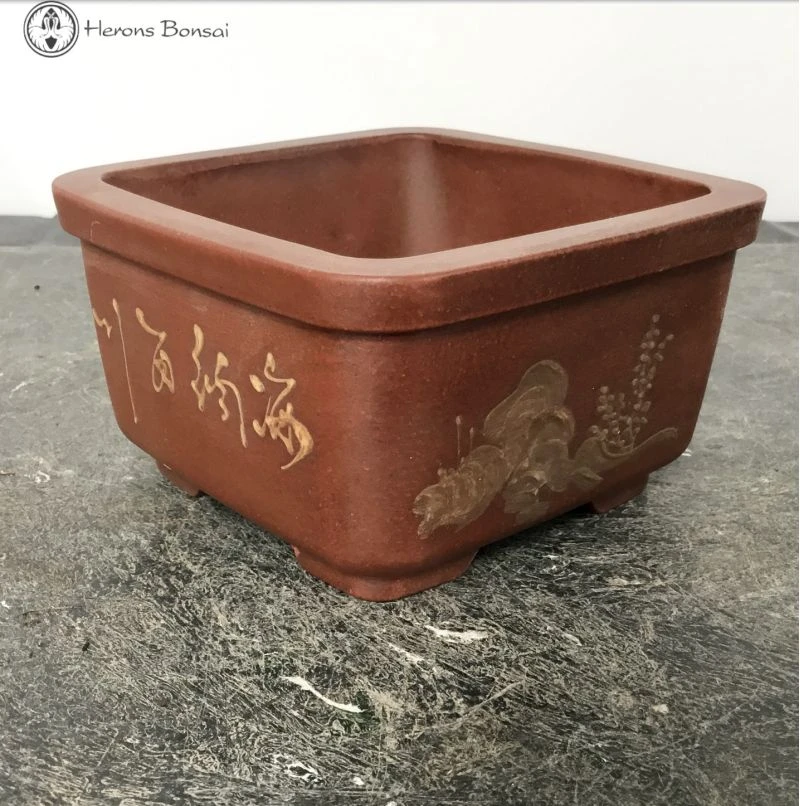 Unglazed Square Ceramic Bonsai Pot with Chinese decoration